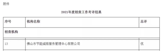 3月24日,广东省生态环境厅发布《广东省生态环境厅关于公布2021年度全国及广东省碳排放权交易企业核查工作考评结果的通知》(粤环函〔2023〕101号),在全省40家核查组织中,节能减排中心作为佛山市唯一一家碳核查组织,2021年度核查工作总评结果为“优”,这是节能减排中心陆续在第二年被评为优秀碳核查组织。