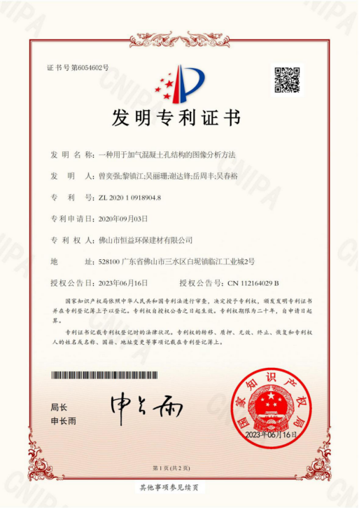 近期,从国家知识产权局传来喜讯,恒益环保建材申报的“一种用于加气混凝土孔结构的图像分析方法”取得国家知识产权局颁发的发明专利证书。