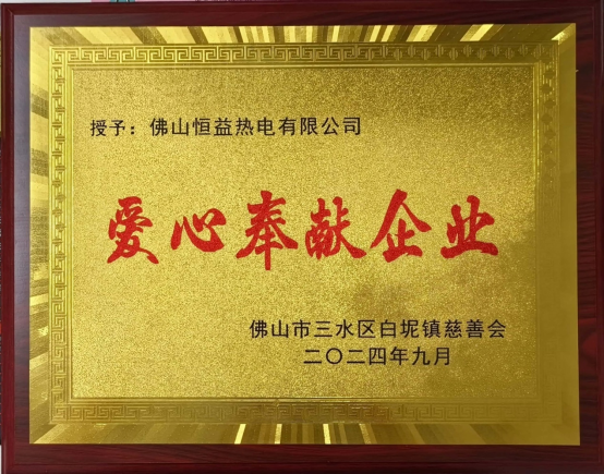 2024年9月5日是我国第九个“中华慈善日”,佛山市三水区政府召开“善作善为,聚力百千万”全区慈善工作会议,会议通报表扬了2023年为三水区慈善事业作出特别贡献的83家企业和工作者,授予佛山恒益热电有限公司“爱心奉献企业”荣誉称号,并颁发了荣誉牌匾。